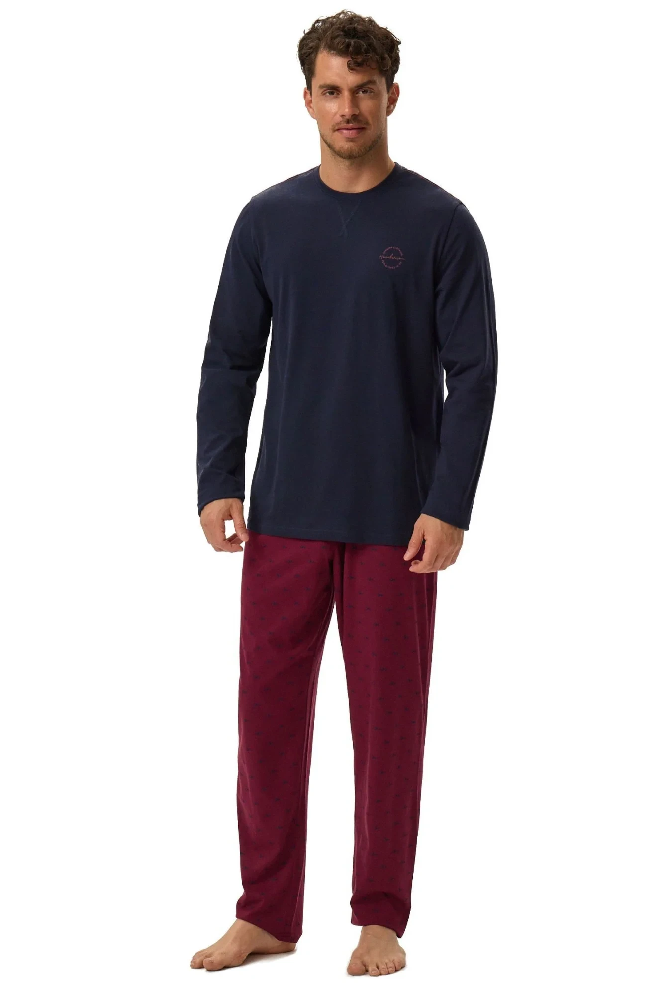 Pánské pyžamo 41915 Hope HENDERSON - z vysoce jakostní bavlny - tmavě modré tričko s dlouhými rukávy - na přední straně ozdobené potiskem - dlouhé tmavě červené kalhoty se vzorem