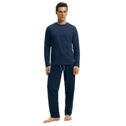 Pánské pyžamo 43455 New blue HENDERSON - z vysoce jakostní bavlny - šedé tričko s dlouhými rukávy - s pruhy - dlouhé jednobarevné kalhoty - elastický pas - zavazování na šňůrku
