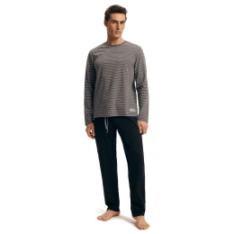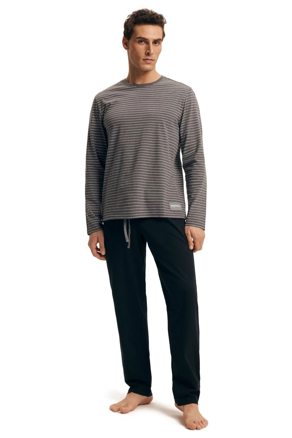 Pánské pyžamo 43455 New grey HENDERSON - z vysoce jakostní bavlny - šedé tričko s dlouhými rukávy - s pruhy - dlouhé jednobarevné kalhoty - elastický pas - zavazování na šňůrku