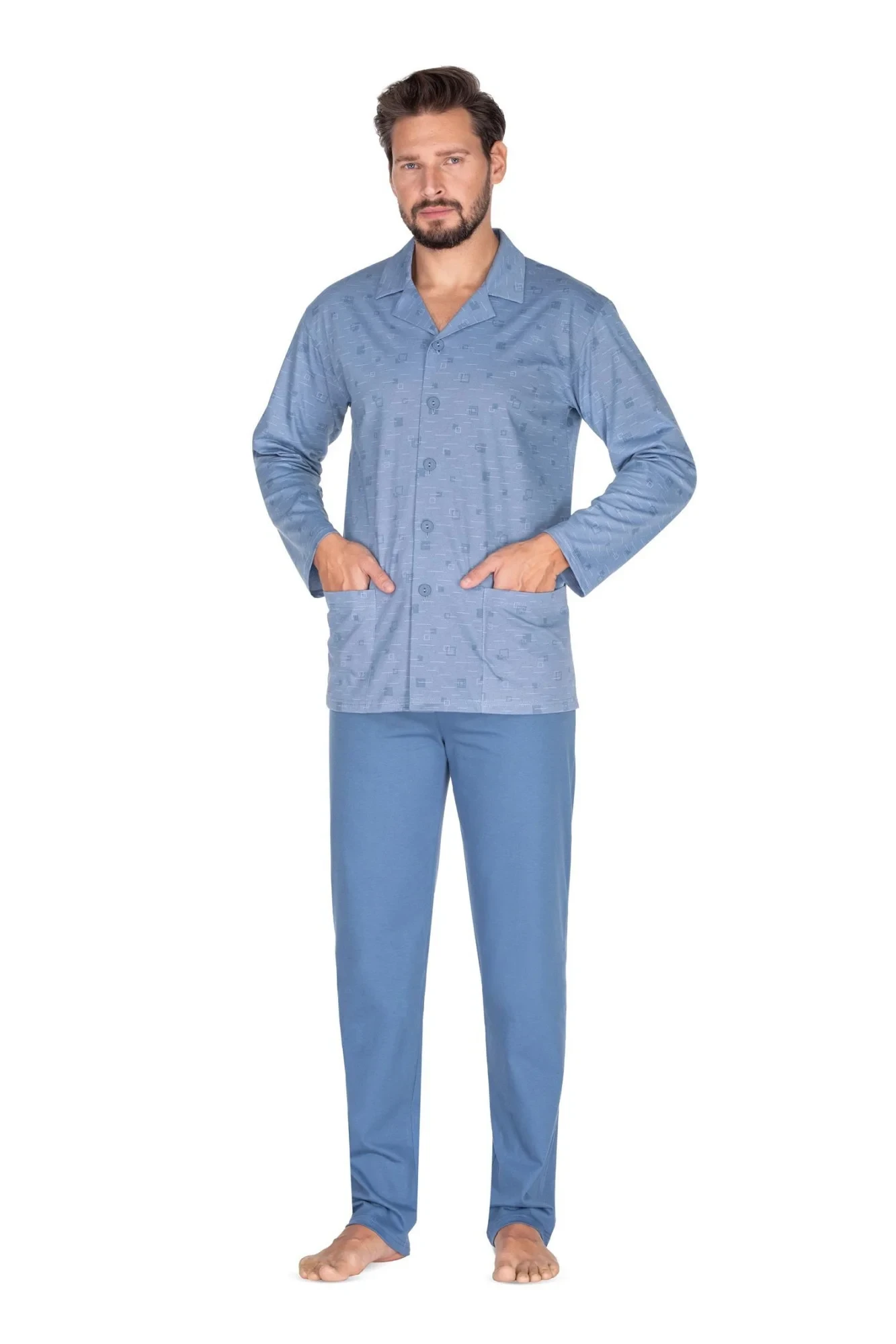 Pánské pyžamo 444 light blue plus REGINA - z vysoce jakostní bavlny - světle modrá košile s dlouhými rukávy - se vzorem - se zapínáním na knoflíky - na bocích kapsy - pohodlné dlouhé světle modré kalhoty