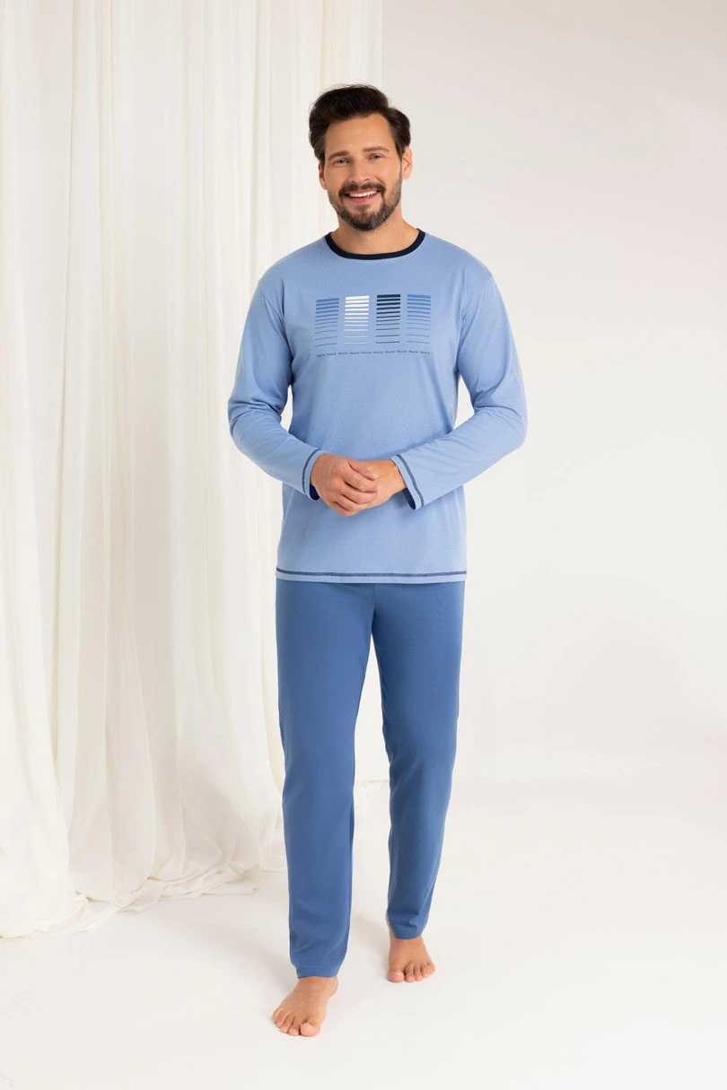 Piżama męska 487 J/25 marki Regina to klasyczna, wygodna propozycja dla panów, którzy cenią prostotę i wysoką jakość wykonania. Koszulka z długim rękawem, wykonana z 100% bawełny, posiada okrągły dekolt i delikatny nadruk na wysokości klatki piersiowej, nadając całości minimalistyczny, ale nowoczesny wygląd. Do kompletu dołączone są długie, jednolite spodnie, które zapewniają pełną swobodę ruchów i komfort noszenia przez całą noc. Idealna na chłodniejsze pory roku, zarówno do spania, jak i relaksu w domu.
