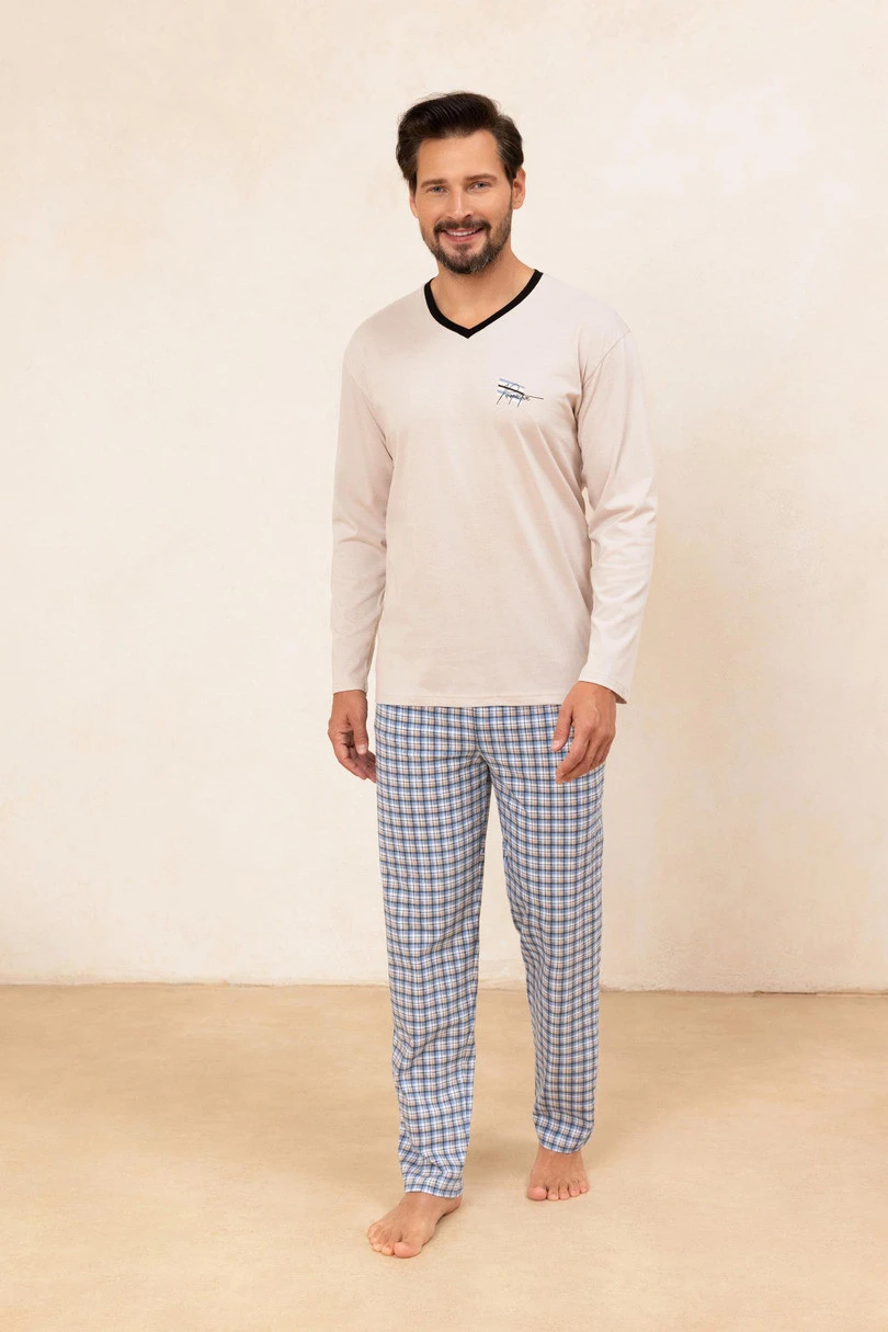 Pánské pyžamo Regina 491 J/25 je dokonalou kombinací klasiky, pohodlí a elegantního provedení. Je vyrobeno ze 100% přírodní, měkké bavlny a poskytuje pohodlí a prodyšnost po celou noc. Tričko s dlouhými rukávy má výstřih ve tvaru srdce zakončený elegantním záhybem a jemným, ozdobným potiskem na hrudi. Soupravu doplňují dlouhé kalhoty v klasickém kostkovaném, volném, uvolněném střihu, které se dokonale přizpůsobí siluetě. Ideální pyžamo pro chladnější dny – stylové, praktické a šetrné k pokožce.