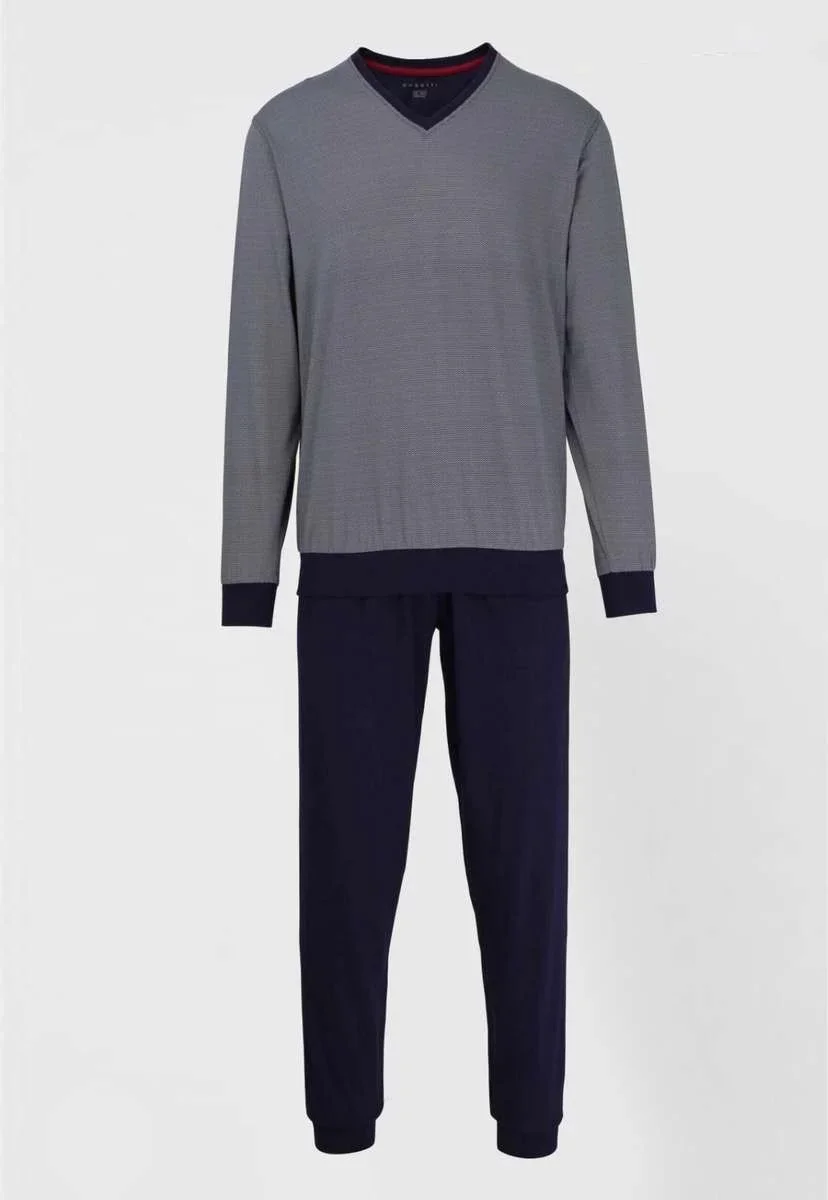 Pánské pyžamo značky Bugatti. Pyžamo má tmavě modré dlouhé kalhoty, tričko má výstřih do V a vzor.