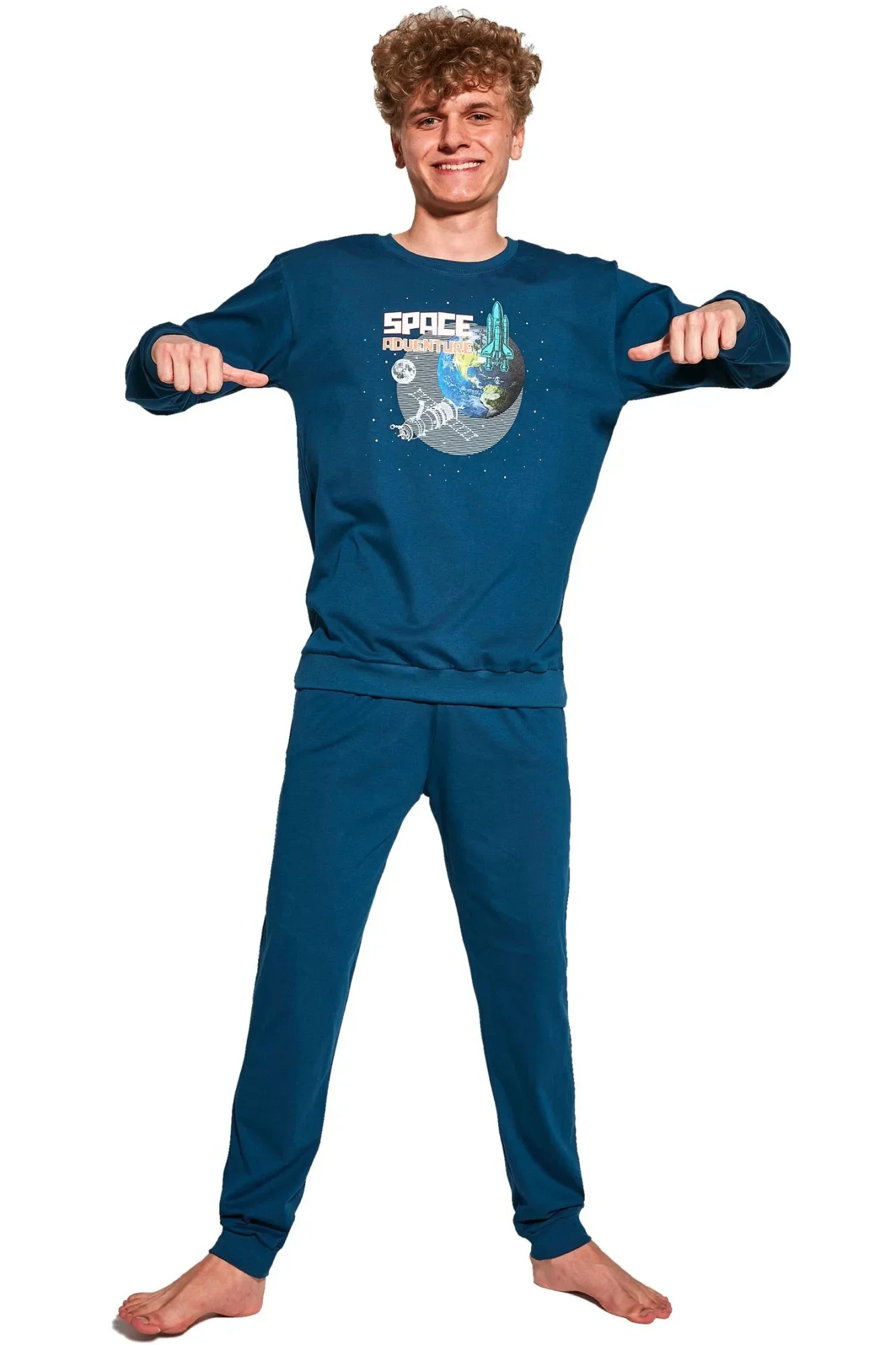 Pánské pyžamo 998/47 Space CORNETTE - z vysoce kvalitní a měkké bavlny - tričko je tmavě modré barvy s dlouhými rukávy - zdobené barevným potiskem - dlouhé jednobarevné kalhoty mají pohodlnou gumu v pase