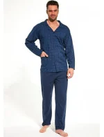 Pánské rozepínací pyžamo od značky Cornette, které je vyrobené z velmi kvalitní bavlny. Vzorovaný vrchní díl pyžama má límeček, kapsy a zapíná se knoflíky. Komplet doplňují dlouhé jednobarevné kalhoty bez úpletů. Vzor vrchního dílu je podle druhého obrázku.