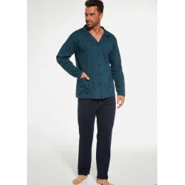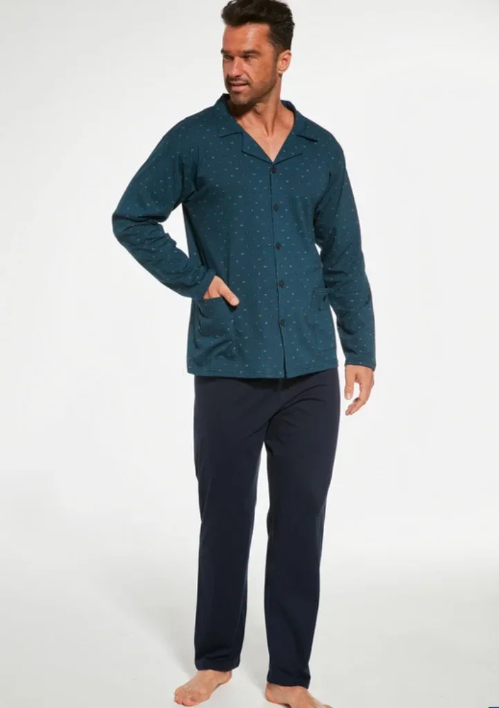 Pánské rozepínací pyžamo od značky Cornette, které je vyrobené z velmi kvalitní bavlny. Vzorovaný vrchní díl pyžama má límeček, kapsy a zapíná se knoflíky. Komplet doplňují dlouhé jednobarevné kalhoty bez úpletů.