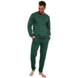 Pohodlné bavlněné pánské pyžamo s dlouhým rukávem a kalhoty od značky Cornette. Vrchní díl má na obou stranách potisk proužků a má kulatý výstřih. Pyžamo má dlouhé kalhoty, které jsou ukončené do úpletů. V pase je všitá pohodlná guma v které je provlečená šňůrka na utáhnutí. Na bocích kalhot jsou zapuštěné kapsy.
