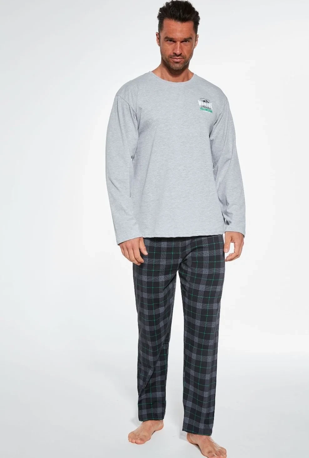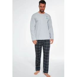 Pohodlné bavlněné pánské pyžamo s dlouhým rukávem a kalhoty od značky Cornette. Vrchní díl má na přední straně potisk a má kulatý výstřih. Pyžamo má dlouhé kalhoty s kostkovaným vzorem a jsou bez úpletů.