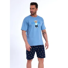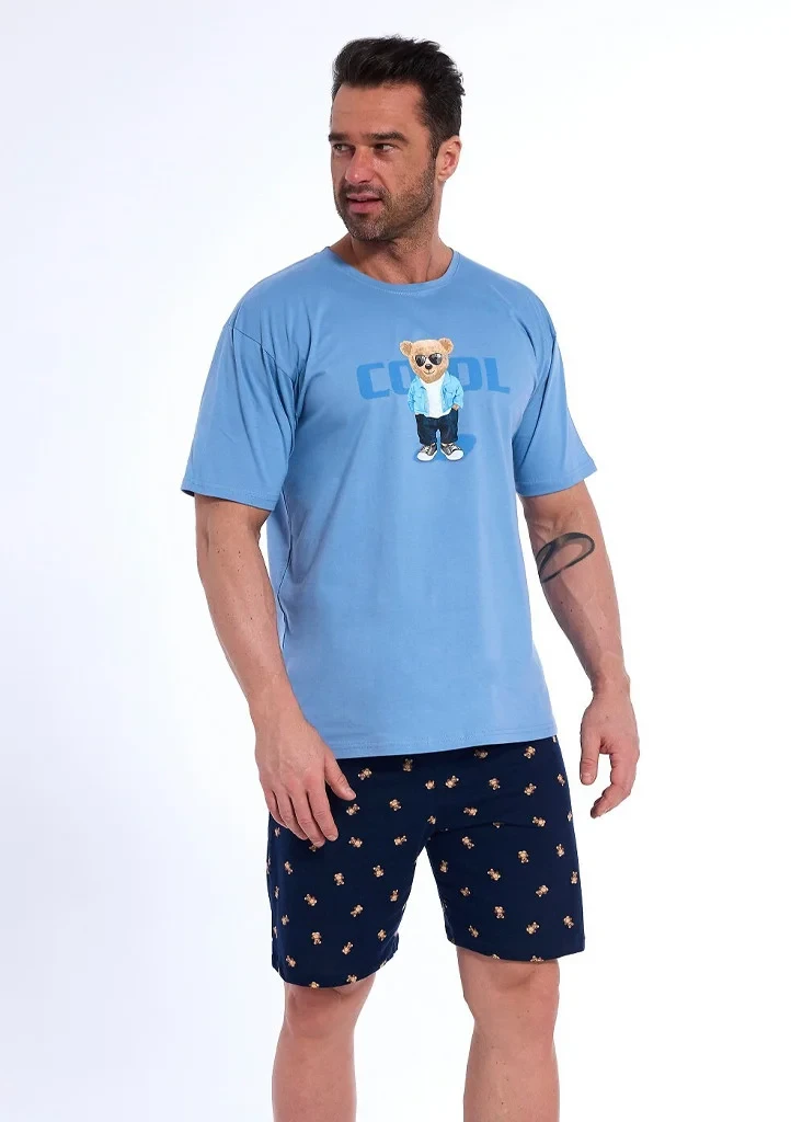 Pánské pyžamo značky Cornette je ideální volbou pro muže, kteří si cení vysoké kvality, pohodlí a originálního stylu. Pyžamo je vyrobeno ze 100% bavlny a skládá se z modrého trička s krátkým rukávem a kulatým výstřihem, které zdobí měkký potisk roztomilého medvídka na přední straně. K tričku ladí krátké vzorované kraťasy s motivem medvídků, které mají v pase širokou, lemovanou gumu pro maximální komfort. Pyžamo je baleno v elegantní dárkové krabičce a představuje skvělý tip na dárek.