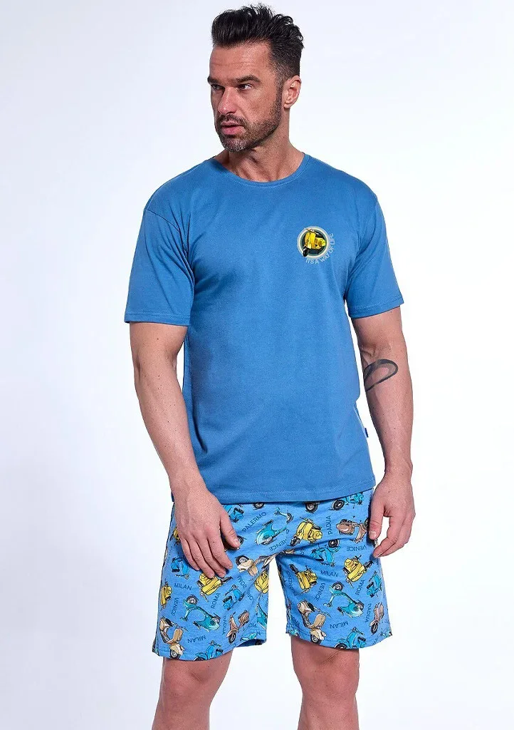 Pánské pyžamo značky Cornette je perfektní volbou pro muže, kteří si zakládají na kvalitě, pohodlí a stylovém vzhledu. Pyžamo je vyrobeno ze 100% bavlny a nabízí maximální komfort pro spánek i domácí pohodu. Součástí je modré tričko s krátkým rukávem, kulatým výstřihem a originálním měkkým potiskem na hrudi. K tomu ladí krátké kraťasy s veselým motivem barevných skútrů a pohodlnou širokou gumou v pase, lemovanou bavlnou. Pyžamo je elegantně zabaleno, což z něj činí skvělý tip na dárek.