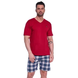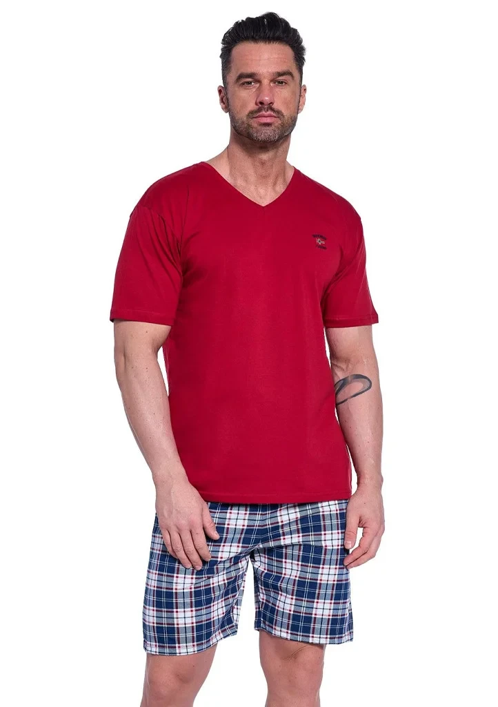 Pánské pyžamo značky Cornette je skvělou volbou pro muže, kteří si potrpí na kvalitu, pohodlí a styl. Pyžamo se skládá z vínového trička s krátkým rukávem a výstřihem do V, které je ozdobeno jemnou výšivkou na hrudi. K tričku patří pohodlné kraťasy s barevným kostkovaným vzorem, v pase doplněné širokou gumou lemovanou bavlnou. Pyžamo je vyrobeno z kvalitních materiálů – horní díl tvoří 80 % bavlny a 20 % polyesteru, kraťasy jsou ze 100% bavlny. Dodává se v elegantní dárkové krabičce a je ideálním tipem na dárek.
