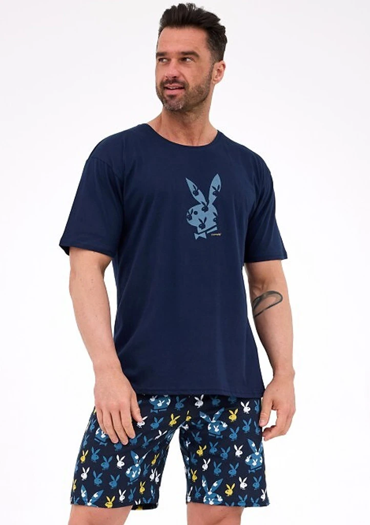 Pánské pyžamo Cornette v tmavě modré barvě spojuje pohodlí a styl v jednom. Tričko s krátkým rukávem zdobí ikonický potisk se symbolem Playboy, zatímco kraťasy s hravým vzorem zajíčků dodávají moderní a odlehčený vzhled. Vyrobeno z kvalitní bavlny, která je příjemná na dotek, prodyšná a ideální pro klidný spánek i domácí pohodu. Skvělá volba pro muže, kteří mají rádi komfort a originalitu.
