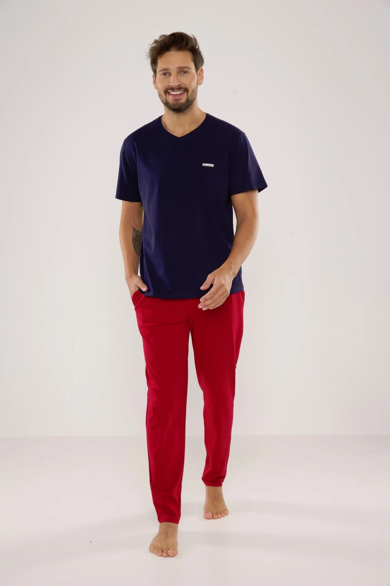 Blůza pyžama má krátké rukávy, výstřih ve tvaru písmene "V" a je ozdobená kapsičkou. Komplet doplňují dlouhé jednobarevné kalhoty.