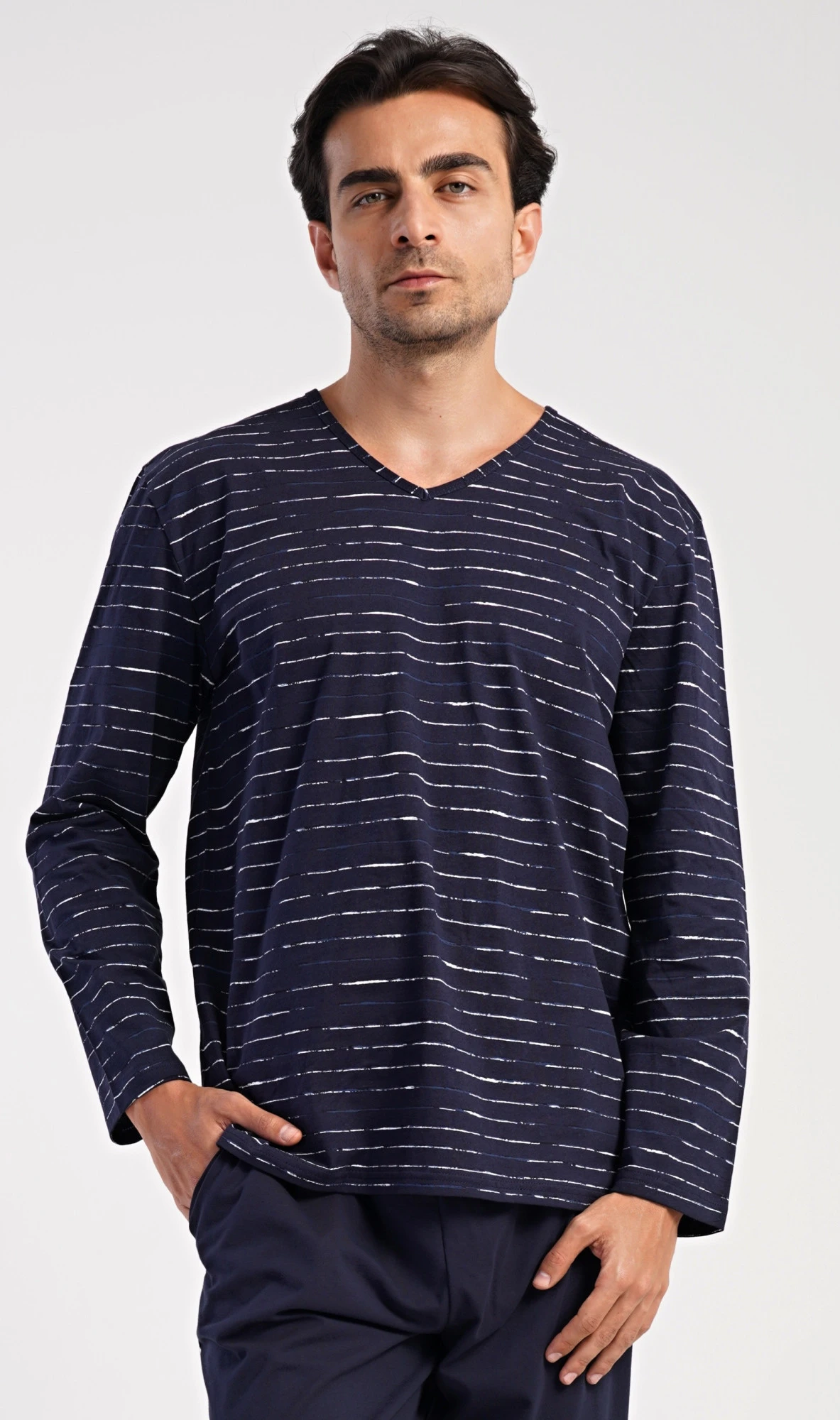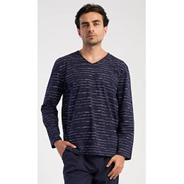 Pánské dlouhé bavlněné pyžamo Bart. Pánské pyžamo se skládá z trika s dlouhým rukávem a dlouhých kalhot. Triko s výstřihem do V zdobí nepravidelné proužky. Jednobarevné kalhoty mají v pase gumu, šňůrku na stažení a praktické kapsy. Použitý materiál s obsahem bavlny 100% je poddajný a příjemný na dotek.