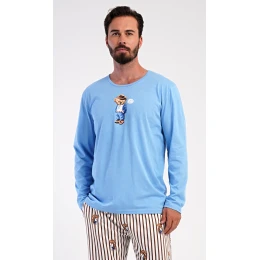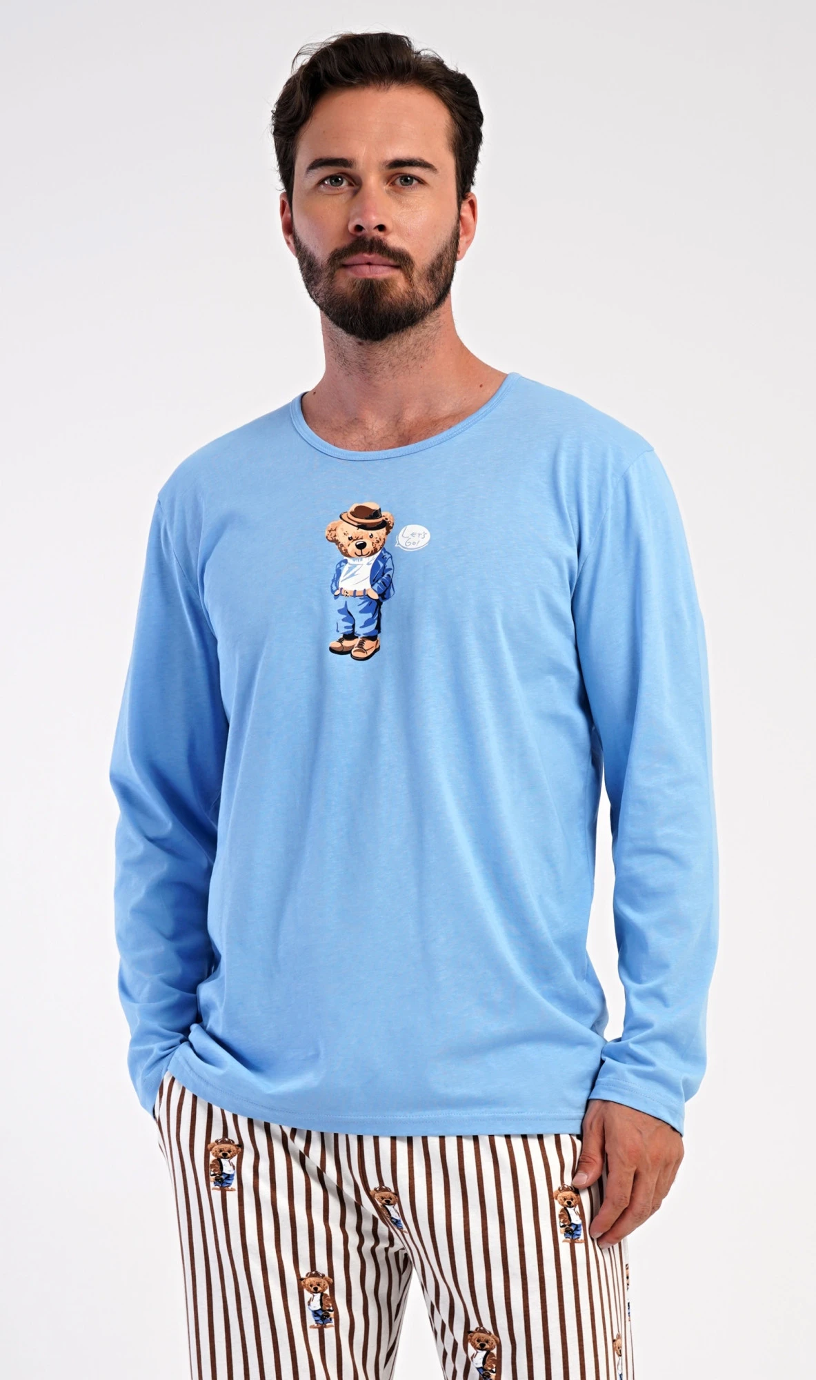 Pánské dlouhé bavlněné pyžamo Bear. Pánské pyžamo se skládá z trika s dlouhým rukávem a dlouhých kalhot. Triko je jednobarevné, zdobené na hrudi obrázkem medvídka. Tento motiv se opakuje i na proužkovaných kalhotách, které mají v pase gumu, šňůrku na stažení a praktické kapsy. Použitý materiál s obsahem bavlny 100% je poddajný a příjemný na dotek.