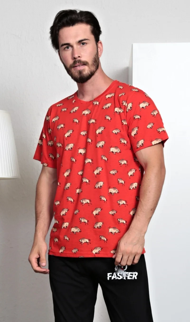 Pánské bavlněné pyžamo dlouhé s krátkým rukávem Býk. Pánské pyžamo se skládá z trička s krátkým rukávem a dlouhých kalhot. Na červeném tričku je je potisk býků. Kalhoty s kapsami mají v pase gumu a šňůrku, nohavice jsou zakončeny patenty. Použitý materiál s obsahem bavlny 100% je příjemný a poddajný na dotek.