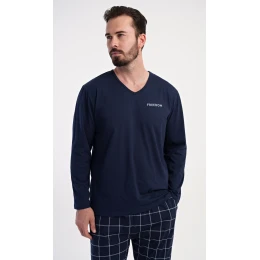 Pánské bavlněné pyžamo s dlouhým rukávem Daniel. Pánské pyžamo se skládá z trika s dlouhým rukávem a dlouhých kalhot. Triko s výstřihem do V zdobí na hrudi drobný nápis FREEDOM. Triko doplňují kárované kalhoty, které mají v pase gumu, šňůrku na stažení a praktické kapsy. Použitý materiál s obsahem bavlny 100% je příjemný a poddajný na dotek.