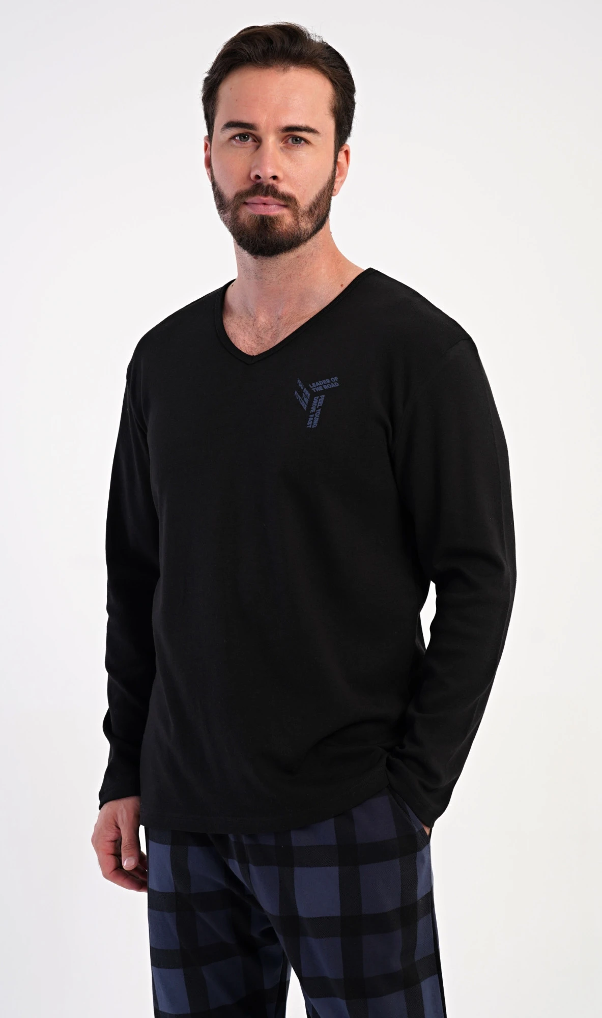 Pánské dlouhé bavlněné pyžamo Erik. Pánské pyžamo se skládá z trika s dlouhým rukávem a dlouhých kalhot. Triko s kulatým výstřihem zdobí na hrudi malý obrázek. Kárované kalhoty mají v pase gumu, šňůrku na stažení a praktické kapsy. Použitý materiál INTERLOK s obsahem bavlny 100% je poddajný a příjemný na dotek.