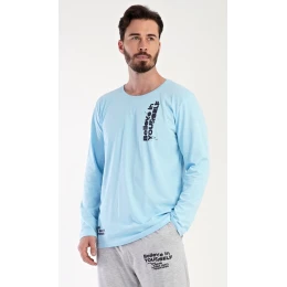 Pánské pyžamo dlouhé Henry. Pánské pyžamo se skládá z trička s dlouhým rukávem a dlouhých kalhot. Na jednobarevném triku s kulatým výstřihem je nápis BELIEVE IN YOURSELF, který se opakuje i na kalhotách. Kalhoty mají v pase gumu, šňůrku na stažení a praktické kapsy. Použitý materiál je jemný a poddajný na dotek. Podíl bavlny u trika je 100% a u kalhot 70%.