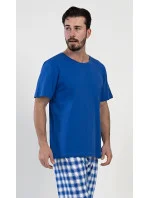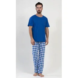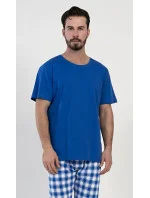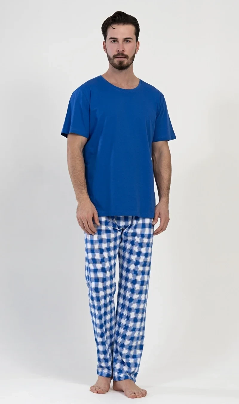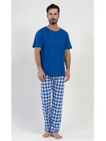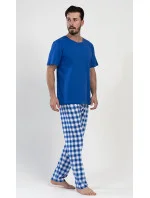 Pánské bavlněné pyžamo dlouhé Karel. Pyžamo se skládá z trička s krátkým rukávem a dlouhých kalhot. Jednobarevné tričko vhodně doplňují kostkované kalhoty, které mají gumu a šňůrku na stažení. Kalhoty nemají kapsy. Použitý materiál s obsahem bavlny 100% je příjemný a poddajný na dotek.