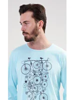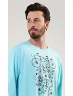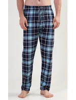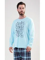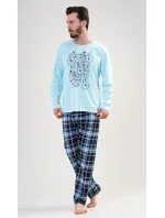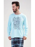 Pánské bavlněné pyžamo dlouhé Kolo. Pánské pyžamo se skládá z trika s dlouhým rukávem a dlouhých kalhot. Na jednobarevném triku je velký obrázek několika propletených kol. Výrazný potisk trika vhodně doplňují kárované kalhoty bez kapes. Kalhoty mají v pase gumu a šňůrku na stažení. Použitý bavlněný materiál je příjemný a poddajný na dotek.