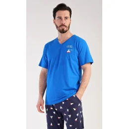 Pánské bavlněné pyžamo dlouhé s krátkým rukávem Loďka. Pánské pyžamo se skládá z trička s krátkým rukávem a dlouhých kalhot. Na modrém tričku s výstřihem do V je malý obrázek loďky a nápis PACIFIC VOYAGE. Kalhoty s kapsami a potiskem loděk mají v pase gumu a šňůrku na stažení. Použitý materiál s obsahem bavlny 100% je příjemný a poddajný na dotek.