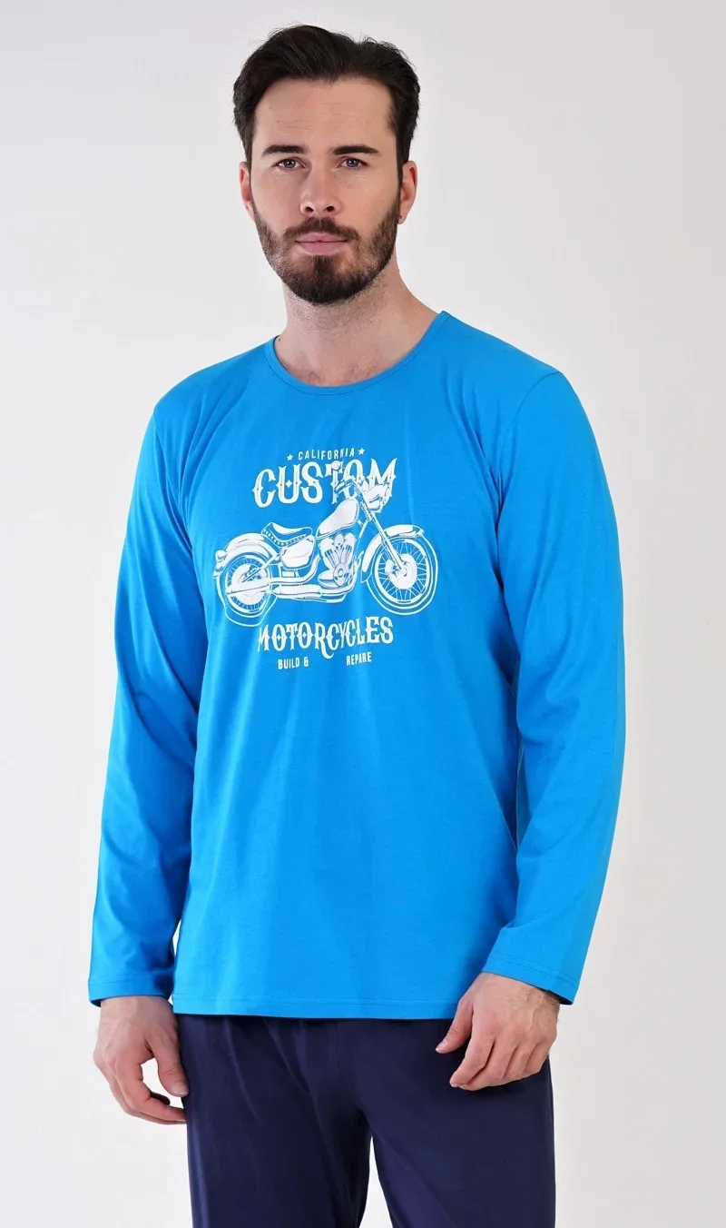 Pánské bavlněné pyžamo dlouhé Motocykl. Pánské pyžamo se skládá z trika s dlouhým rukávem a dlouhých kalhot. Jednobarevné triko zdobí obrázek motorky a nápis 'California custom motocycle'. Kalhoty mají v pase gumu a šňůrku na stažení. Nemají kapsy. Použitý materiál je příjemný a poddajný na dotek. Podíl bavlny u trika a kalhot je 100%.