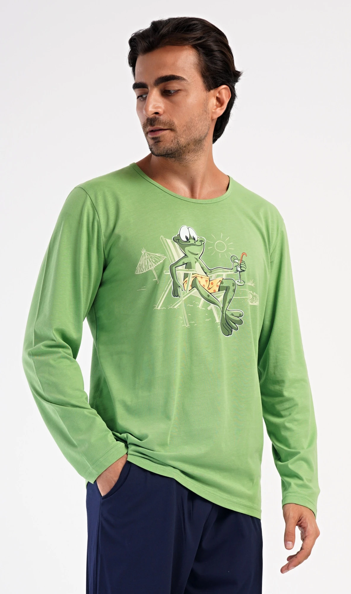 Pánské dlouhé bavlněné pyžamo No stress. Pánské pyžamo se skládá z trika s dlouhým rukávem a dlouhých kalhot, které jsou zakončeny lemy. Triko s kulatým výstřihem zdobí na hrudi obrázek žabáka. Jednobarevné kalhoty mají v pase gumu, šňůrku na stažení a praktické kapsy. Použitý materiál s obsahem bavlny 100% je poddajný a příjemný na dotek.