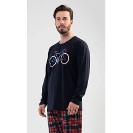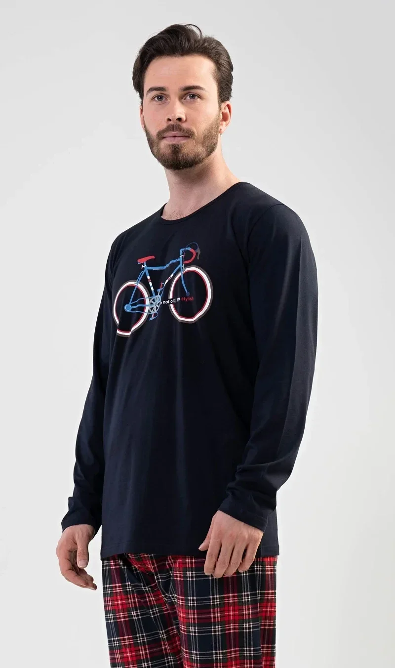 Pánské bavlněné pyžamo dlouhé Old bike. Pánské pyžamo se skládá z trika s dlouhým rukávem a dlouhých kalhot. Na jednobarevném triku je obrázek kola a nápis I´m not old, I´m stylish. Triko vhodně doplňují kárované kalhoty bez kapes. Kalhoty mají v pase gumu a šňůrku na stažení. Použitý bavlněný materiál je příjemný a poddajný na dotek.