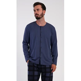 Pánské dlouhé bavlněné pyžamo Rudolf. Pánské pyžamo se skládá z trika s dlouhým rukávem a dlouhých kalhot. Triko s kulatým výstřihem má zapínání na knoflíky. Kárované kalhoty mají v pase gumu, šňůrku na stažení a praktické kapsy. Použitý materiál s obsahem bavlny 100% je poddajný a příjemný na dotek.