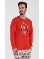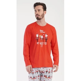 Pánské bavlněné pyžamo dlouhé Santa. Pánské pyžamo se skládá z trika s dlouhým rukávem a dlouhých kalhot. Jednobarevné triko zdobí nápis a obrázek tří Santů. Na kalhotách se tento motiv opakuje také. Kalhoty mají v pase gumu, šňůrku na stažení a praktické kapsy. Použitý materiál je jemný a poddajný na dotek. Podíl bavlny u trika a kalhot je 100%.