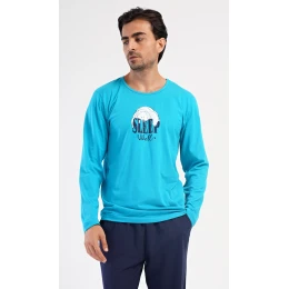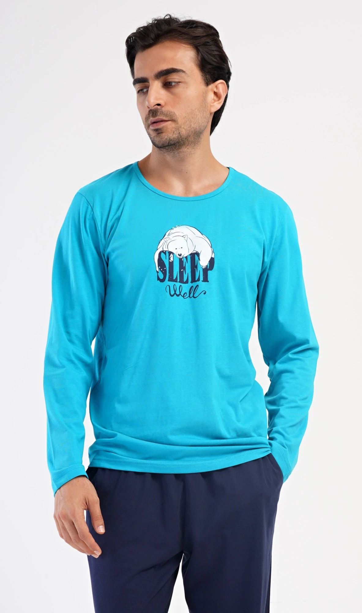 Pánské dlouhé bavlněné pyžamo Sleep. Pánské pyžamo se skládá z trika s dlouhým rukávem a dlouhých kalhot, které jsou zakončeny lemy. Triko s kulatým výstřihem zdobí na hrudi obrázek ledního medvěda a nápis SLEEP WELL. Jednobarevné kalhoty mají v pase gumu, šňůrku na stažení a praktické kapsy. Použitý materiál s obsahem bavlny 100% je poddajný a příjemný na dotek.