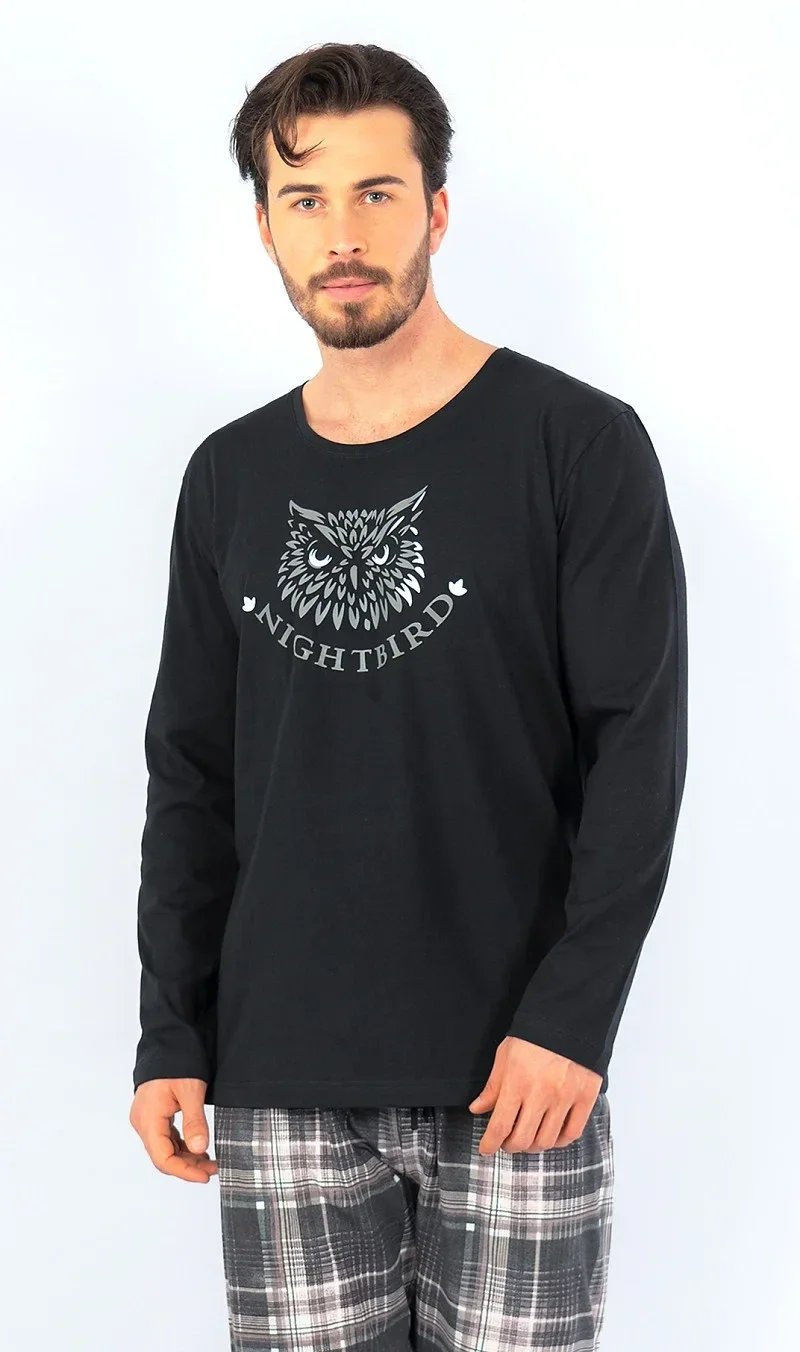 Pánské bavlněné pyžamo dlouhé Sova. Pánské pyžamo se skládá z trika s dlouhým rukávem a dlouhých kalhot. Na jednobarevném triku je obrázek sovy, pod kterou je nápis Nightbird. Kalhoty jsou kostkované, mají gumu a šňůrku na stažení. Nemají kapsy. Použitý materiál s podílem bavlny 100% je příjemný a poddajný na dotek.
