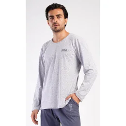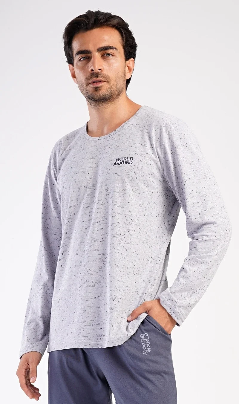 Pánské dlouhé bavlněné pyžamo World around. Pánské pyžamo se skládá z trika s dlouhým rukávem a dlouhých kalhot. Triko je zdobené nepravidelnými proužky a nápisem 'World around'. Drobný nápis najdete i na jednobarevných kalhotách, které mají v pase gumu, šňůrku na stažení a praktické kapsy. Použitý materiál s obsahem bavlny 100% je poddajný a příjemný na dotek.