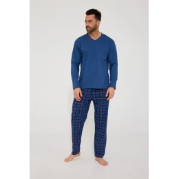Piżama męska DR 122/210 VICTOR to klasyczna propozycja dla mężczyzn ceniących wygodę, naturalne materiały i ponadczasowy styl. Wykonana w 100% z wysokiej jakości bawełny, zapewnia doskonałą oddychalność, miękkość i komfort noszenia przez całą noc. Bluza z długim rękawem oraz dekoltem w kształcie litery „V” nadaje piżamie elegancki, męski charakter, a praktyczna kieszonka na wysokości klatki piersiowej stanowi stylowy i funkcjonalny detal.