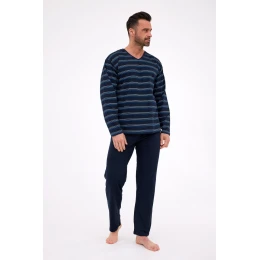 Pánská pyžamová souprava DR 139 BIG J/25 je elegantní a pohodlná souprava, vytvořená s ohledem na pohodlí a styl. Tričko s dlouhými rukávy, vyrobené ze směsi 88 % bavlny a 12 % polyesteru, má nadčasový pruhovaný vzor a je zakončeno lodičkovým výstřihem, který působí klasicky. Soupravu doplňují pevné dlouhé kalhoty ze 100 % bavlny, které zaručují volnost pohybu a měkkost při styku s pokožkou. V pase jsou opatřeny pohodlnou gumou, která dokonale padne. Pyžamo je zabaleno v elegantní krabičce, takže je ideální jako dárek.