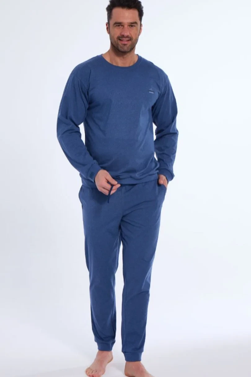 Pánské pyžamo s dlouhými rukávy, kulatý výstřih, dlouhé kalhoty se šňůrkou v pase, kapsy, pyžamo balené v krabici.