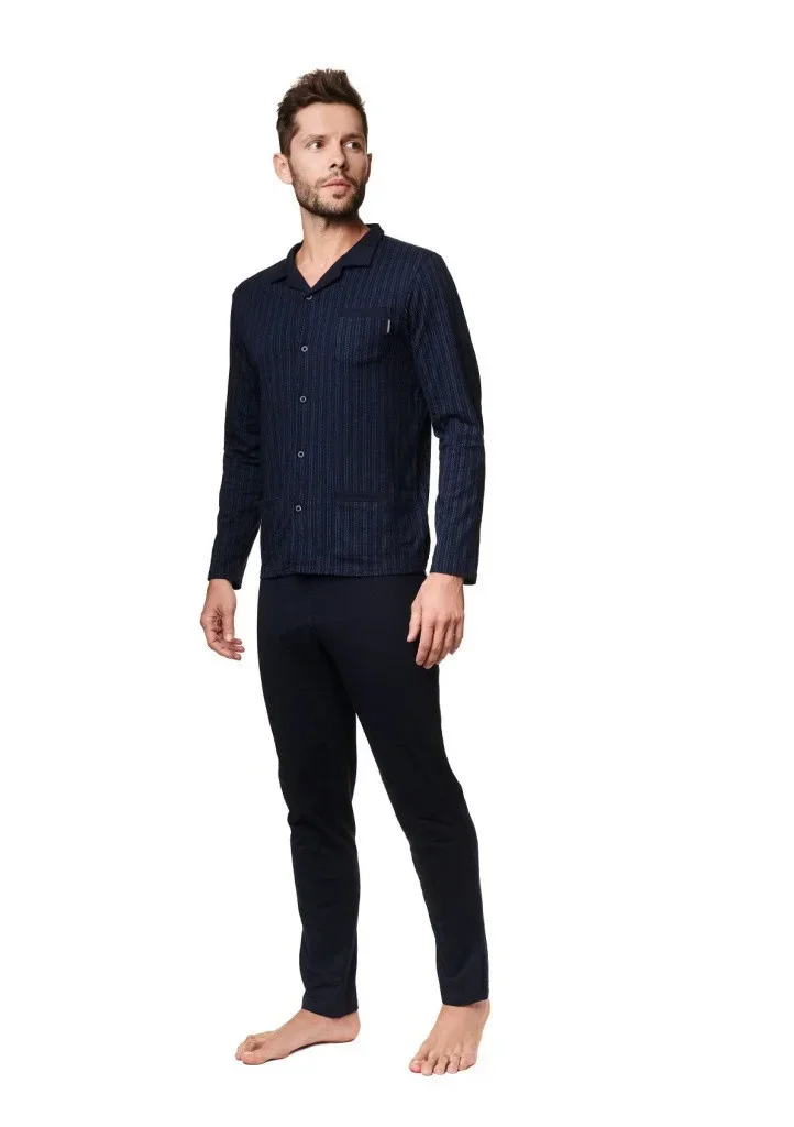 Pánské dvoudílné pyžamo vyrobené z bavlny. Horní díl má dlouhé rukávy, propínání na přední části. Dlouhé jednobarevné kalhoty mají v pase pružnou gumu .