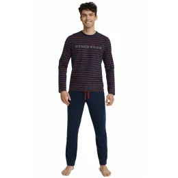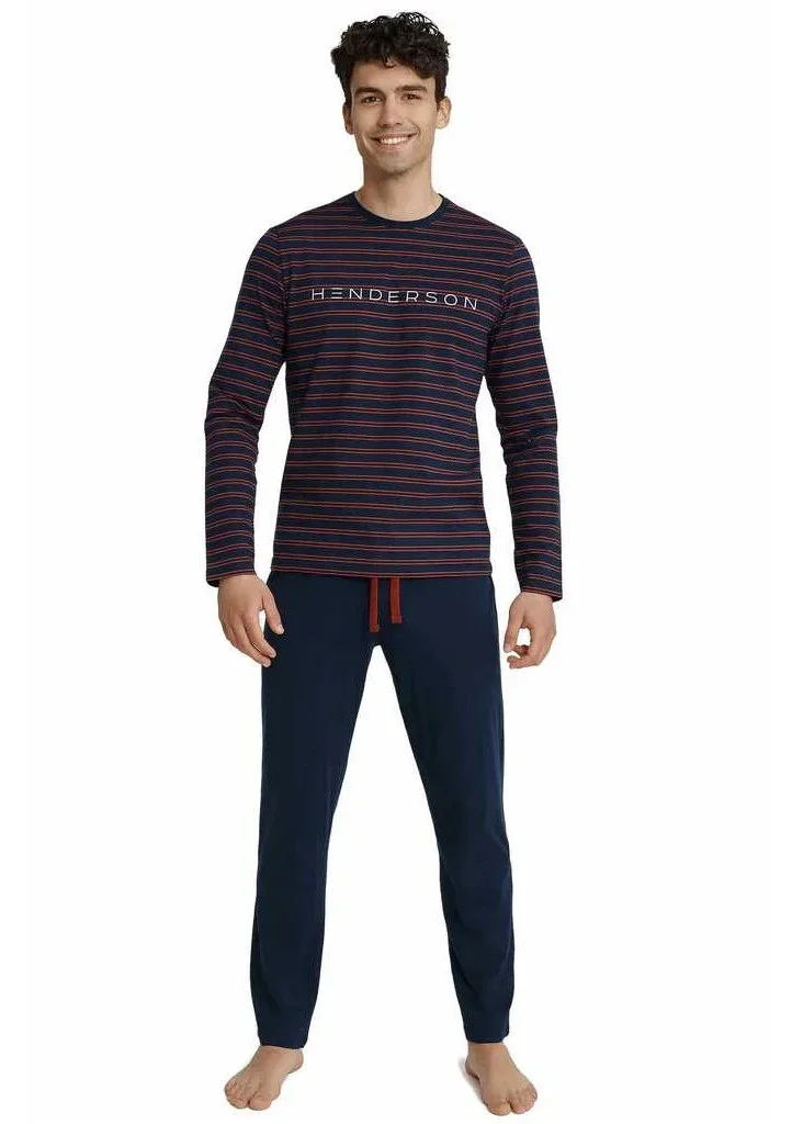 Pánské pyžamo od značky Henderson je vyrobeno z příjemného a kvalitního materiálu. Pyžamo je ze 100% bavlny a proto je velmi příjemné a pohodlné. Tričko má dlouhý rukáv, kulatý výstřih a po celé ploše jemné proužky a nápis Henderson. Kalhoty mají dlouhé nohavice a v pase všitou pohodlnou gumu s navlečenou šňůrkou