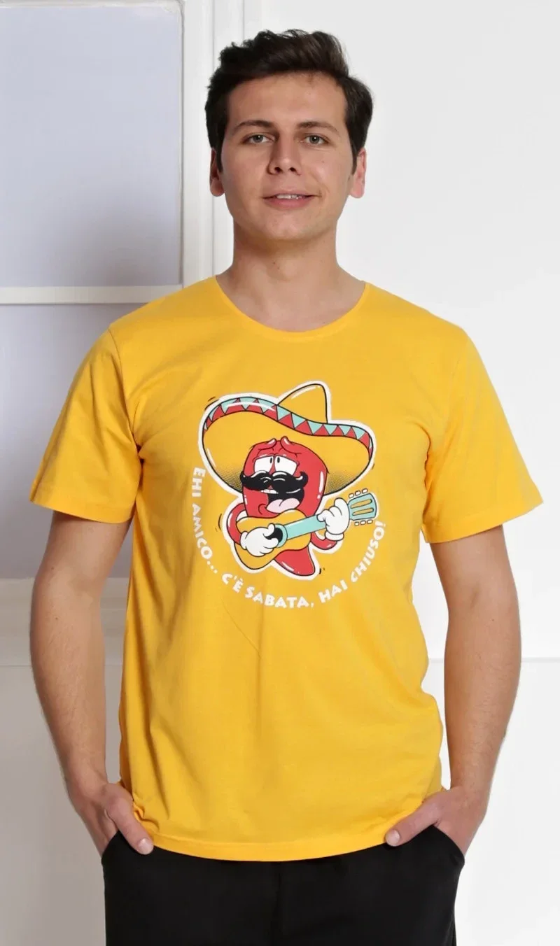 Pánské bavlněné kapri pyžamo Mexiko. Pánské pyžamo se skládá z trička s krátkým rukávem a tříčtvrtečních kalhot. Na jednobarevném tričku je obrázek chilli papričky s obrovským sombrérem, která hraje na kytaru. Tričko vhodně doplňují jednobarevné kalhoty pod kolena, které mají v pase gumu, šňůrku na stažení a praktické kapsy. Použitý materál s obsahem bavlny 100% je příjemný a poddajný na dotek.