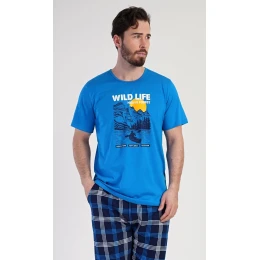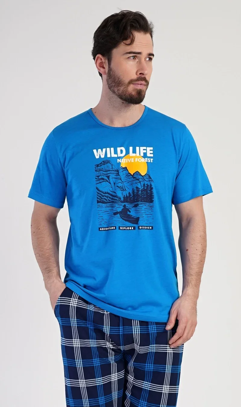 Pánské bavlněné kapri pyžamo Wild life. Pánské pyžamo se skládá z trička s krátkým rukávem a tříčtvrtečních kalhot. Jednobarevné tričko s kulatým výstřihem má na hrudi obrázek horského jezera a drobný nápis 'Wild life'. Tričko vhodně doplňují kárované kalhoty pod kolena, které mají v pase gumu, šňůrku na stažení a kapsy. Použitý materál s obsahem bavlny 100% je příjemný a poddajný na dotek.