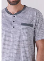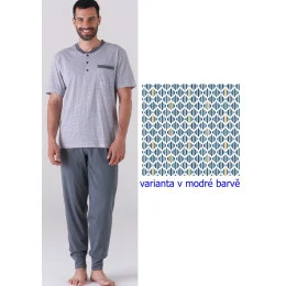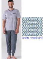 Pánské bavlněné pyžamo italské značky Karelpiu. Pyžamo je ze 100% bavlny, velmi příjemné a pohodlné i v letních měsících. Tričko má krátký rukáv, kulatý výstřih a légu se třemi knoflíky. Na levé přední straně je našitá kapsička. Volné kalhoty mají v pase pohodlnou pružnou gumu, nohavice jsou ukončeny širokou mnažetou.
