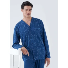 Pánské pyžamo značky Karelpiu. Pyžamo se skládá z kabátku, který je celopropínací na knoflíky, výstřih je do "V". Na levé straně je našitá kapsička a kapsičky jsou našité i ve spodní části. Kalhoty jsou v pase do pružné obšité gumy. Pyžamo nemá žádné lemy a je pohodlné na nošení, je ušité z příjemné bavlny.