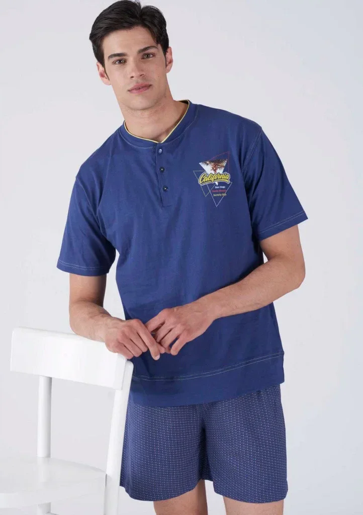 Pánské bavlněné pyžamo italské značky Karelpiu. Pyžamo je ze 100% bavlny, velmi příjemné a pohodlné i v letních měsících. Tričko má krátký rukáv, kulatý výstřih a légu se třemi knoflíky. Volné kraťasy mají v pase pohodlnou pružnou gumu.