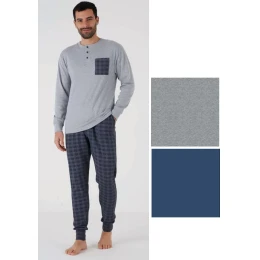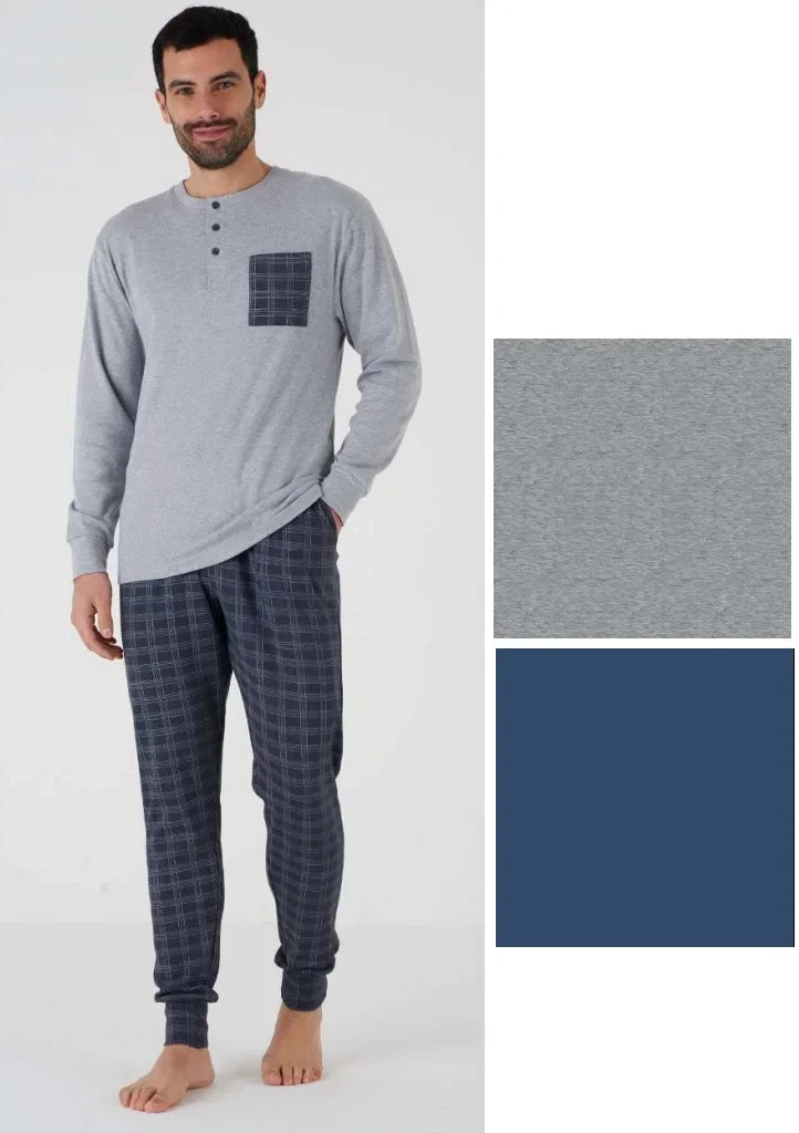 Pánské pyžamo italské značky Karelpiu. Pyžamo se skládá ze dvou dílů. Tričko má dlouhé rukávy, které jsou ukončené do manžety. Spodní část je volná, okolo krku je kulatý výstřih, který má légu na tři knoflíky. Na levé straně je našitá kapsička. Kalhoty jsou v pase do pohodlné gumy, nohavice jsou ukončené do pružné manžety. Pyžamo je ušité z příjemné hřejivé bavlny.