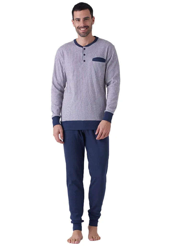 Pánské bavlněné pyžamo italské značky Karelpiu. Pyžamo je ze 100% bavlny, velmi příjemné a pohodlné. Tričko má dlouhý rukáv, kulatý výstřih a légu se třemi knoflíky. Na levé přední straně je našitá kapsička. Volné kalhoty mají v pase pohodlnou pružnou gumu, nohavice jsou ukončeny širokou mnažetou.