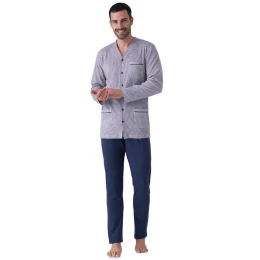 Pánské pyžamo značky Karelpiu. Pyžamo se skládá z kabátku, který je celopropínací na knoflíky, výstřih je do "V". Na levé straně je našitá kapsička a kapsičky jsou našité i ve spodní části. Kalhoty jsou v pase do pružné obšité gumy. Pyžamo nemá žádné lemy a je pohodlné na nošení, je ušité z příjemné bavlny.