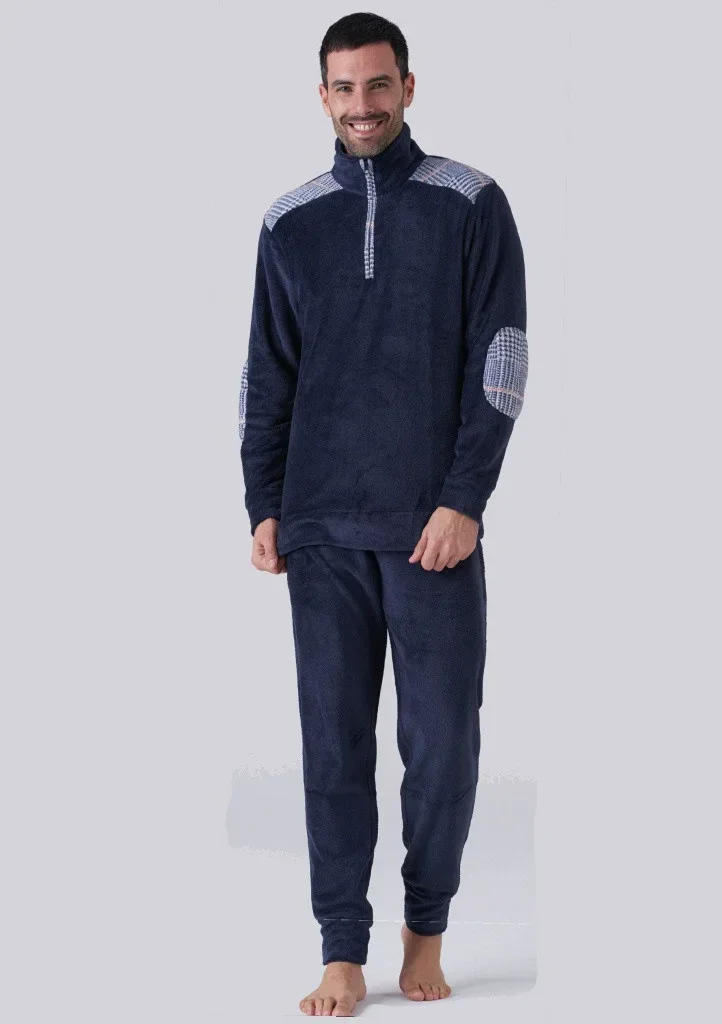Pánské pyžamo značky Karelpiu. Pyžamo je hřejivé a pohodlné na nošení. Kabátek má stojáček na zip, rukávy jsou ukončené do manžety. Na ramenou a na loktech jsou našité barevné aplikace. Kalhoty jsou v pase do pohodlné obšité gumy, nohavice jsou ukončené do manžety.