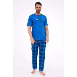 Piżama męska MARATHON 3 to wygodny komplet wykonany z naturalnej, 100% bawełny, idealny dla mężczyzn ceniących prostotę i jakość. Koszulka z krótkim rękawem i półokrągłym dekoltem posiada nowoczesny, kolorowy nadruk na piersi, który nadaje całości sportowego charakteru. Długie spodnie w modną kratkę wyposażone są w elastyczną gumkę w pasie, obszytą bawełnianym materiałem, co zapewnia komfort noszenia bez ucisku. To idealna piżama zarówno do spania, jak i wieczornego relaksu w domu.