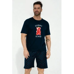 Piżama męska KR 326/205 GUMMY KING to wygodna i stylowa propozycja dla mężczyzn ceniących komfort oraz oryginalny design. Wykonana w 100% z wysokiej jakości bawełny, gwarantuje przewiewność, miękkość i komfort noszenia przez całą noc. Koszulka z krótkim rękawem i półokrągłym dekoltem została ozdobiona nadrukiem czerwonego żelka w koronie z napisem „Gummy King”, który nadaje całości nowoczesnego i humorystycznego charakteru.